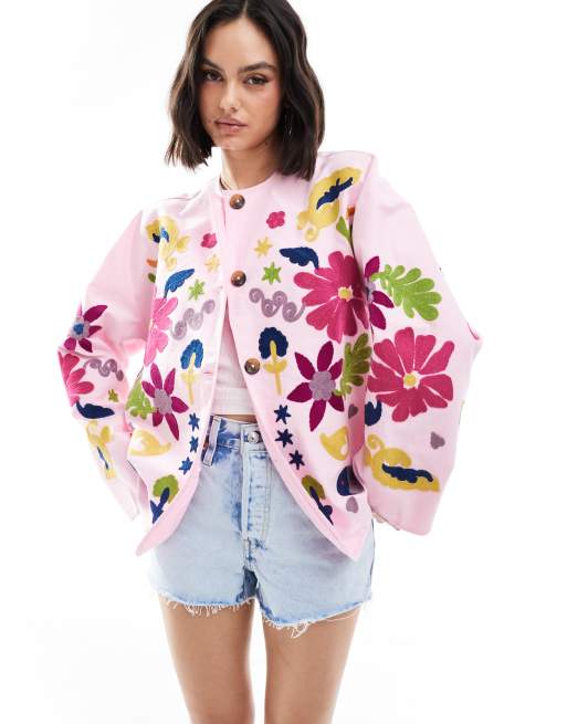 ASOS DESIGN - Veste brodée sans col - Rose délavé