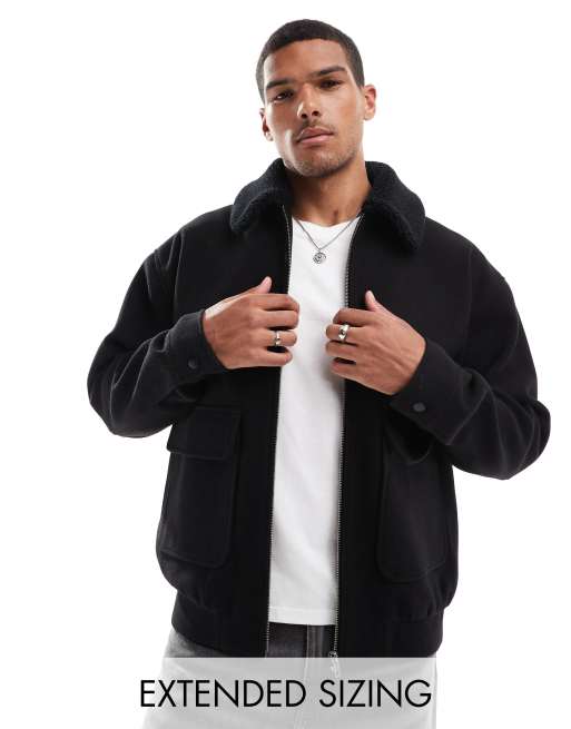 ASOS DESIGN - Veste harrington aspect laine avec col en imitation peau de mouton - Noir