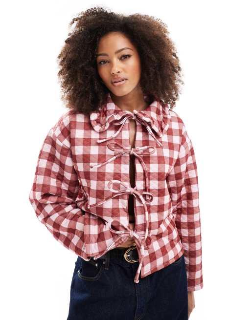 ASOS DESIGN - Veste matelassée à col et manches longues avec imprimé carreaux vichy - Bordeaux et rose