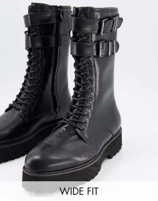 ASOS DESIGN Wide Fit - Bottines à lacets en imitation cuir avec semelle plateforme épaisse et détails métalliques - Noir