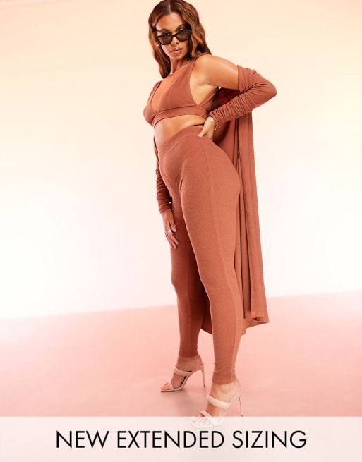 ASOS LUXE - Ensemble confort côtelé avec cardigan long, brassière et legging - Acajou