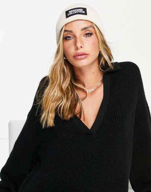 ASOS - Weekend Collective - Bonnet côtelé avec logo et revers - Beige