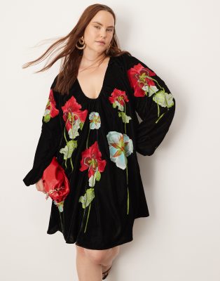 ASOS EDITION Curve - Robe courte et fluide en velours avec décolleté plongeant et broderies fleuries - Noir