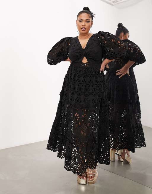 ASOS EDITION Curve - Robe mi-longue torsadée sur le devant en broderie anglaise à manches bouffantes - Noir