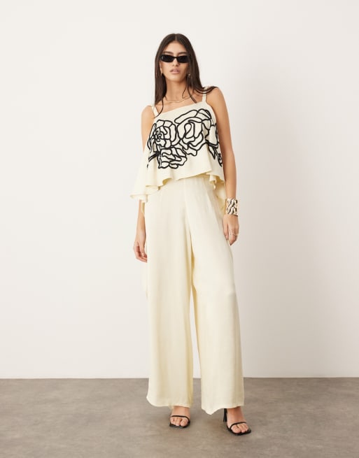 ASOS EDITION - Ensemble top coupe carrée à fleurs brodées linéaires et dos découvert et pantalon - Crème