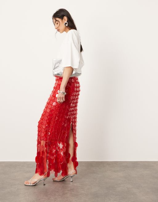 ASOS EDITION - Jupe longue style futuriste à sequins et ourlet à franges - Rouge