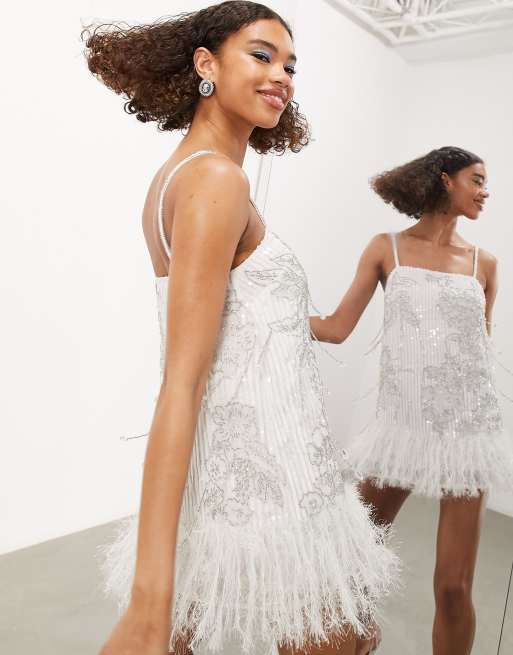 ASOS EDITION - Robe courte avec perles et fleurs à sequins avec ourlet à plumes synthétiques - Blanc