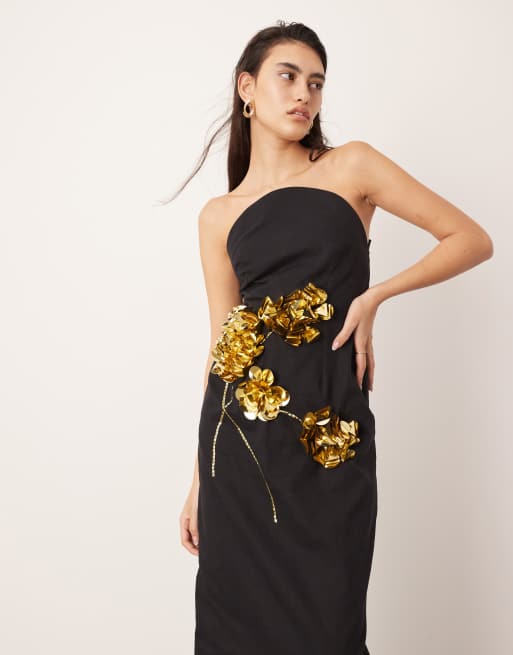 ASOS EDITION - Robe droite mi-longue coupe bandeau ornée de fleurs sculpturales - Noir