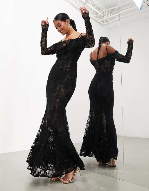 ASOS EDITION - Robe longue avec ourlet sirène en dentelle, appliqué fantaisie et col bénitier - Noir