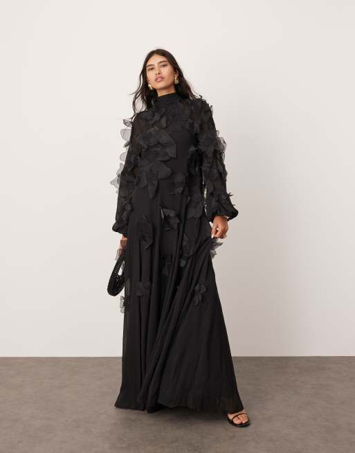 ASOS EDITION - Robe longue coupe trapèze à appliqués fleurs sur l'ensemble et encolure nouée - Noir