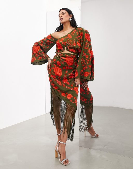 ASOS EDITION - Robe mi-longue brodée avec manches kimono à épaules tombantes et ourlet à franges - Vert olive