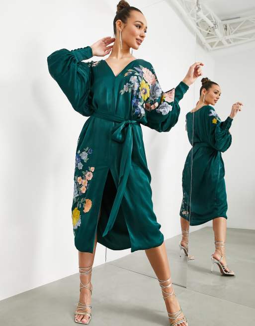 ASOS EDITION - Robe mi-longue en satin avec ceinture et fleurs brodées - Vert forêt