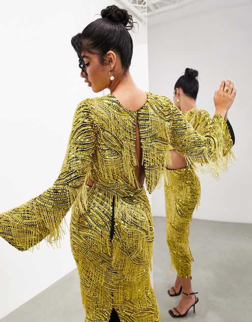 ASOS EDITION - Top fendu dans le dos orné de perles et franges - Noir/jaune