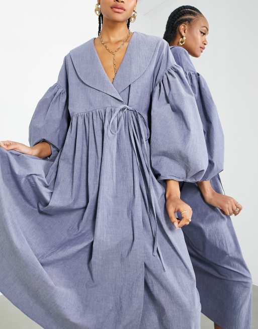 ASOS EDITION - Robe portefeuille mi-longue à smocks avec col - Bleu délavé