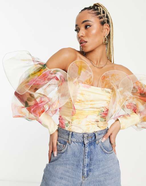 ASOS LUXE - Body à armatures en dentelle avec encolure Bardot et imprimé fleurs
