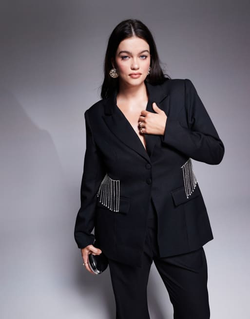 ASOS LUXE Curve - Blazer ajusté d'ensemble avec franges à strass - Noir