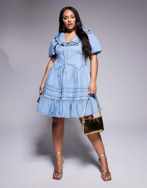 ASOS LUXE Curve - Robe courte en denim avec manches bouffantes et col - Bleu