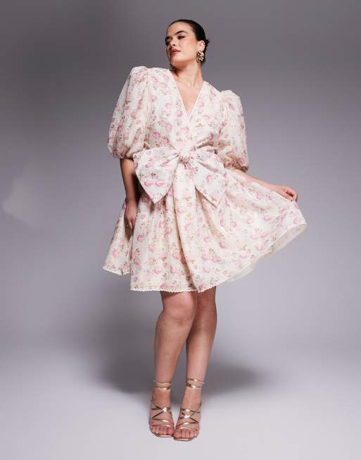 ASOS LUXE Curve - Robe courte en jacquard à manches bouffantes et nœud - Imprimé fleurs