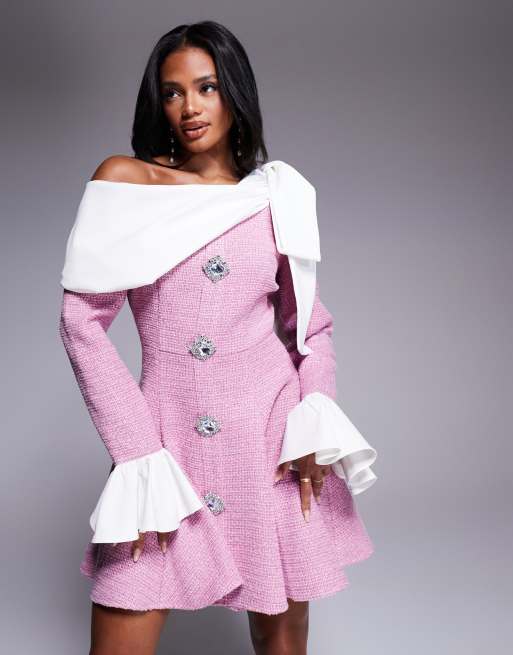ASOS LUXE - Robe courte en popeline et maille bouclée avec boutons ornementés - Rose