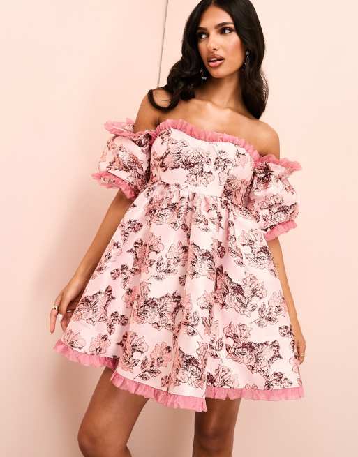 ASOS LUXE - Robe courte patineuse à manches bouffantes et épaules dénudées en jacquard floral avec bords en organza - Rose fleuri