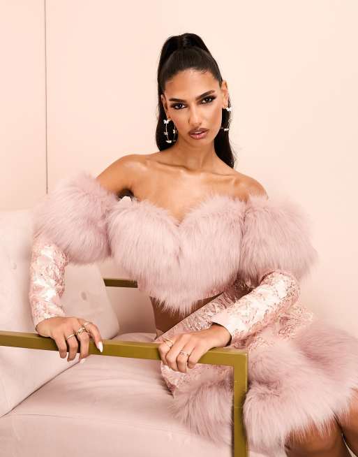 ASOS LUXE - Top en jacquard floral et fausse fourrure à décolleté en cœur - Rose blush