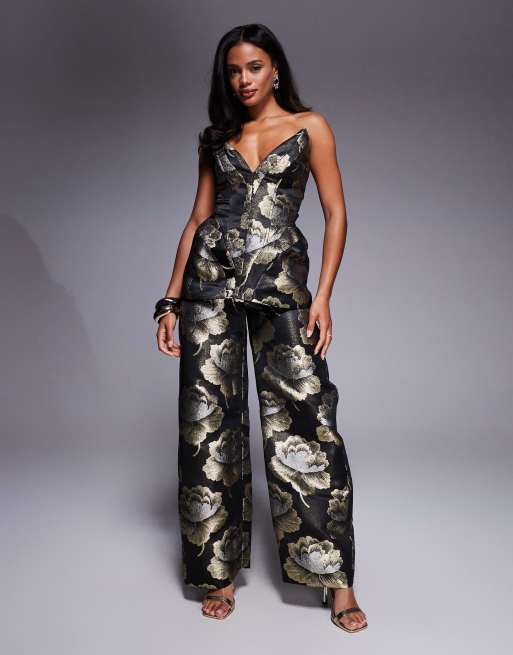 ASOS LUXE - Top structuré en jacquard et pantalon bouffant - Noir et doré fleuri