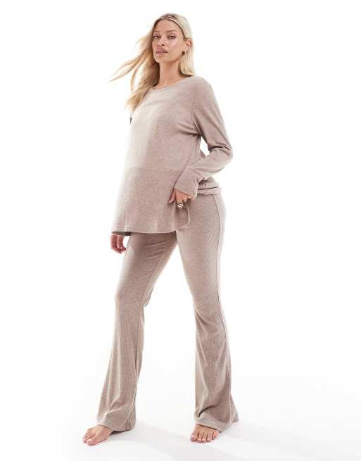 ASOS DESIGN Maternity - Ensemble côtelé avec top manches longues à finitions en velours et pantalon à taille rabattue - Marron clair