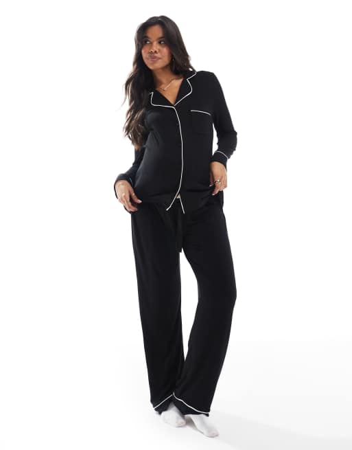 ASOS DESIGN Maternity - Pyjama ultra doux avec pantalon et chemise à manches longues et liserés contrastants - Noir