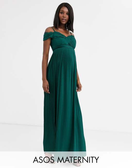 ASOS DESIGN Maternity - Robe longue plissée en dentelle avec encolure Bardot - Vert forêt