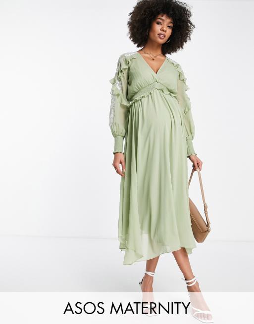 ASOS DESIGN Maternity - Robe mi-longue avec finitions en dentelle brodée - Vert sauge