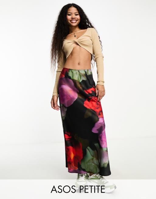 ASOS DESIGN Petite - Jupe longue en satin avec coupe en biais et imprimé foncé de roses