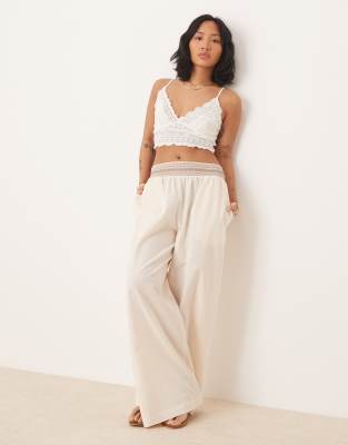 ASOS DESIGN Petite - Pantalon large à enfiler en lin mélangé avec taille froncée - Crème et marron