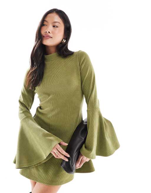 ASOS DESIGN Petite - Robe courte en velours côtelé avec manches évasées - Olive