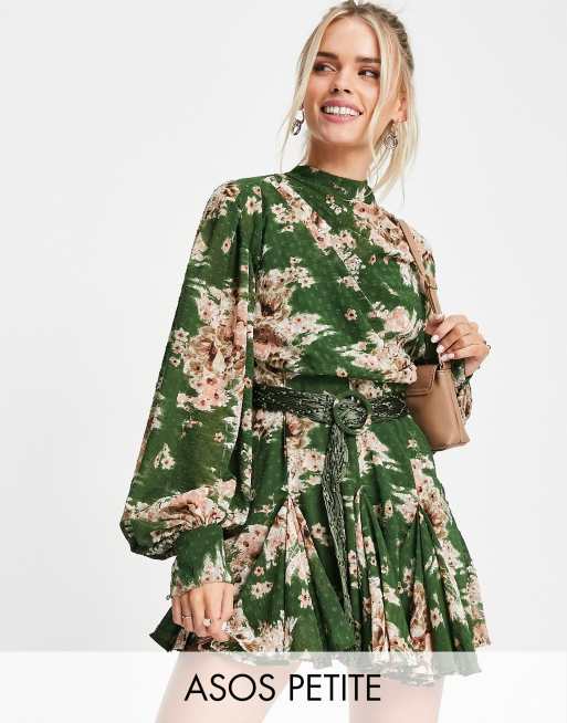 ASOS DESIGN Petite - Robe courte plissée à col montant en jacquard fleuri avec ceinture en macramé et godets