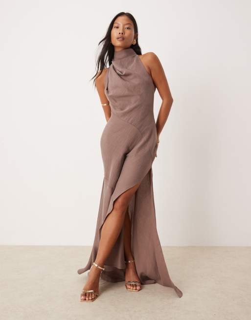 ASOS DESIGN Petite - Robe longue asymétrique à col montant et cuisse fendue - Taupe