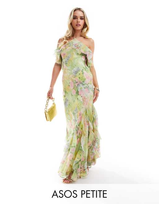 ASOS DESIGN Petite - Robe longue dos nu coupée en biais à volants et imprimé fleurs - Vert