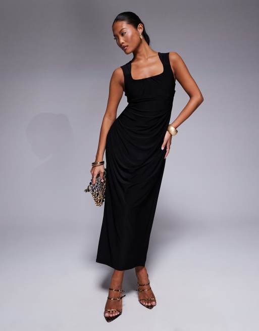ASOS DESIGN Petite - Robe mi-longue effet drapé avec encolure structurée et bretelles larges - Noir