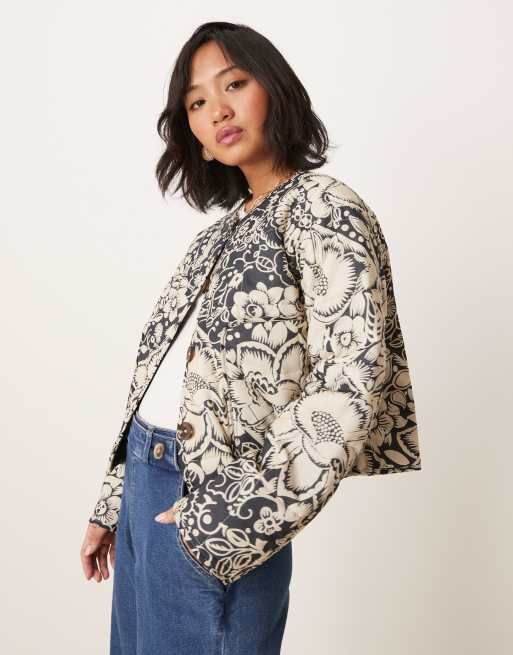 ASOS DESIGN Petite - Veste matelassée courte sans col à imprimé fleurs - Noir et blanc