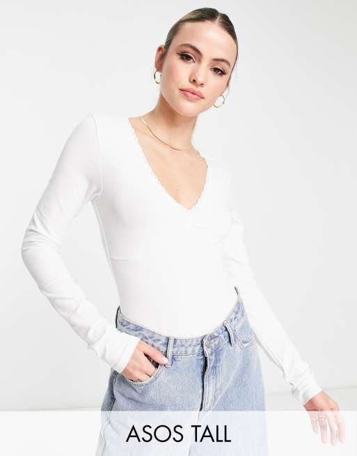 ASOS DESIGN Tall - Body manches longues à col V et bordures dentelle - Blanc