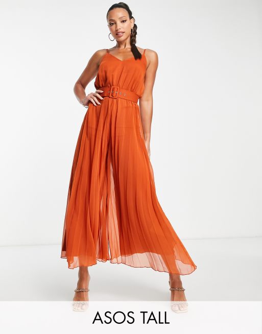 ASOS DESIGN Tall - Combinaison plissée ceinturée à la taille avec bretelles fines - Marron