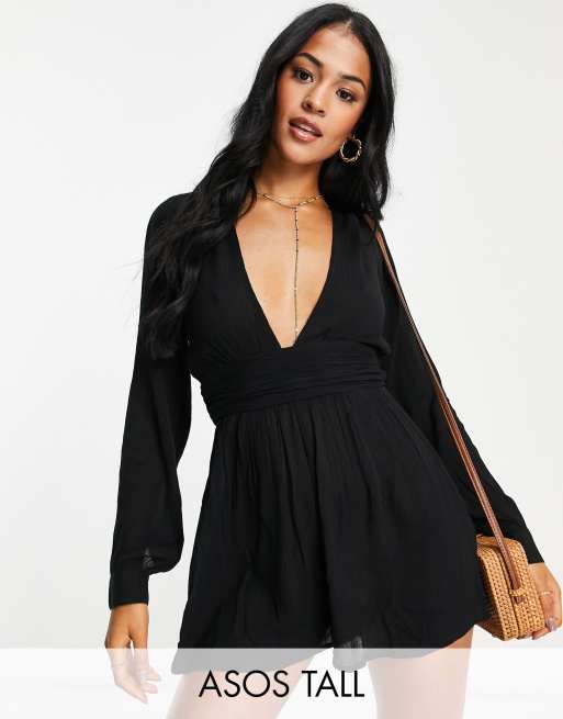 ASOS DESIGN Tall - Combishort de plage à manches longues et décolleté plongeant - Noir