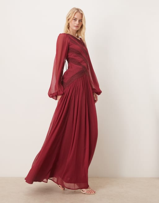 ASOS DESIGN Tall - Robe longue asymétrique à manches longues bords en dentelle - Rouge