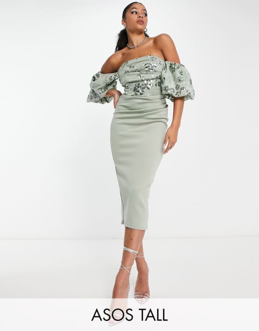 ASOS DESIGN Tall - Robe mi-longue à ornements fleuris avec manches bouffantes et encolure Bardot - Vert poudré