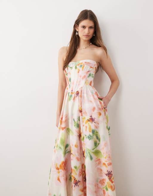 Bardot - Lola - Robe bandeau longue à imprimé fleuri flou avec corset à armatures - Rose