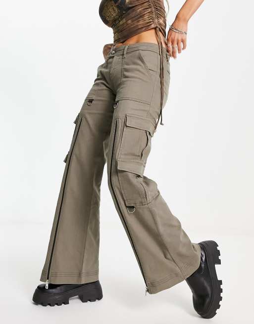Basic Pleasure Mode - Pantalon cargo évasé à taille basse avec fermetures éclair - Kaki