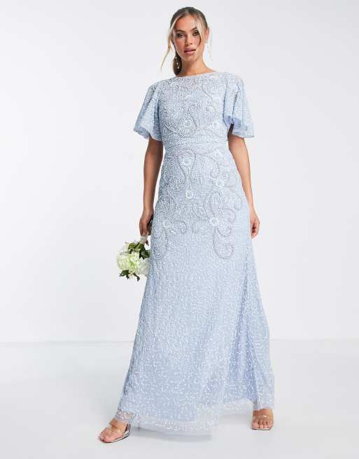 Beauut - L'invitée - Robe longue à ornements ton sur ton sur l'ensemble et manches évasées - Bleu clair