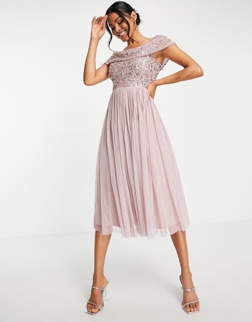 Beauut - L'invitée - Robe mi-longue ornementée à encolure Bardot - Rose glacé
