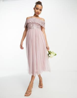Beauut - L'invitée - Robe mi-longue ornementée à encolure Bardot - Rose glacé