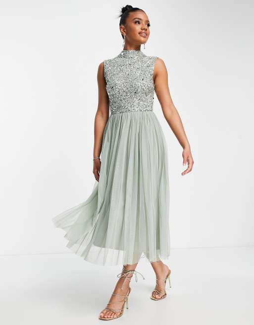 Beauut - Robe mi-longue 2 en 1 ornementée délicate pour demoiselle d'honneur avec jupe ample en tulle - Sauge