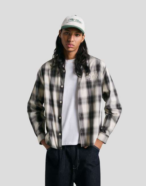 Bershka - Chemise brodée à carreaux et manches longues - Gris